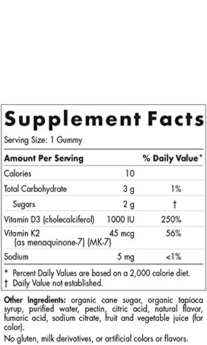 With 1000 IU of vitamin D3 (cholecalciferol) plus 45 mcg of vitamin K2 (as menaquinone-7) in each serving, Vitamin D3+K2 Gummies provide delicious, convenient support for bone health. Vitamin D3 helps the body absorb calcium from the gut and reabsorb calcium from the kidneys while vitamin K2 supports the formation of healthy bones, and directs calcium away from accumulating in the arteries. In combination, vitamins D3 and K2 help the body use calcium effectively and maintain healthy bone density and muscle function. These pectin-based, gelatin-free gummies support the structural integrity of bones and help improve bone health by increasing bone mass and reducing bone loss. These gummies have a delicious pomegranate flavor and no artificial coloring, flavoring, or preservatives.