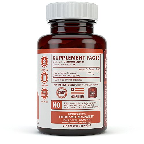 Ceylon Cinnamon Capsules (Made with Organic Cinnamon) by Nature's Wellness are a genuine "true cinnamon" dietary supplement, harvested responsibly from sources in Ceylon. Multiple studies and health organizations, including US Dept. of Agriculture, list natural cinnamon among the most potent sources of crucial antioxidant nutrients of any food. Cinnamon is linked with numerous health and longevity benefits, including: