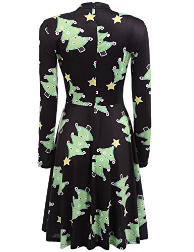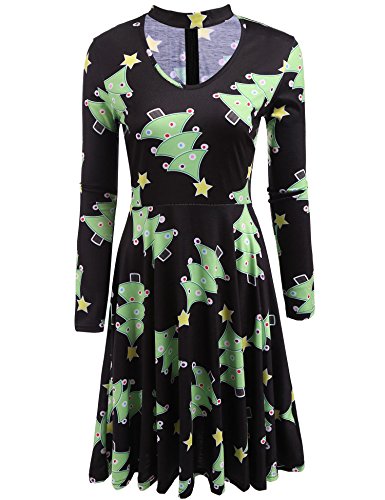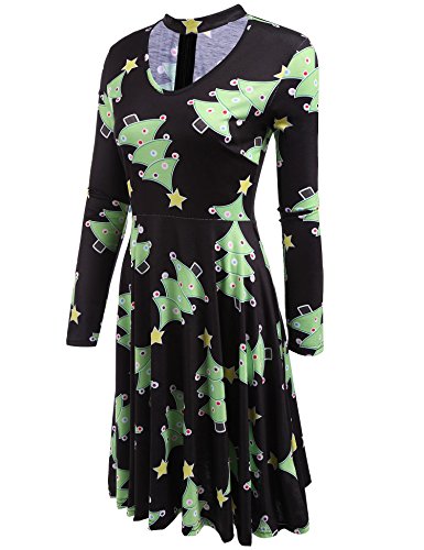 Elesol Women Long Sleeve Choker V Neck Christmas Tree Patterned Skater Dress Green L