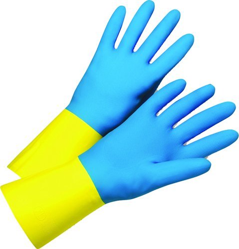 West Chester 00134 Latex Unsupported Flock Lined Cleaning Glove, Neoprene Coated, Work, Beaded Cuff, 28 mil Thickness, 13" Length, Large, Blue Yellow (Pack of 1 Pair)