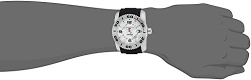 White Dial with Silver Tone and White Hands and Hour Markers and White Arabic Numerals; Stainless Steel Case; Black Silicone Strap with Stainless Steel Accents