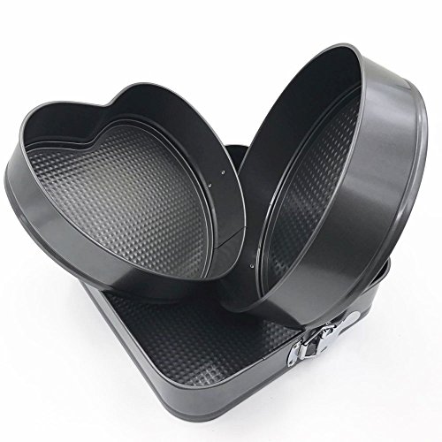 Product Description This bakeware set allows you to have fun with your families and kids of making homemade cake at anytime at home kitchen. Three different cake molds (square, round, heart-shaped) let you have multi-choice for different person's preference. Nonstick coating and Leak resistant design allows easy food release and cleanup. This set of three pans is just what you need for all your dessert baking needs. Package Including: 1pcs 11" Square Springform Pan 1pcs 10" Round Springform Pan 1pcs 9" heart-shaped Springform Pan 0