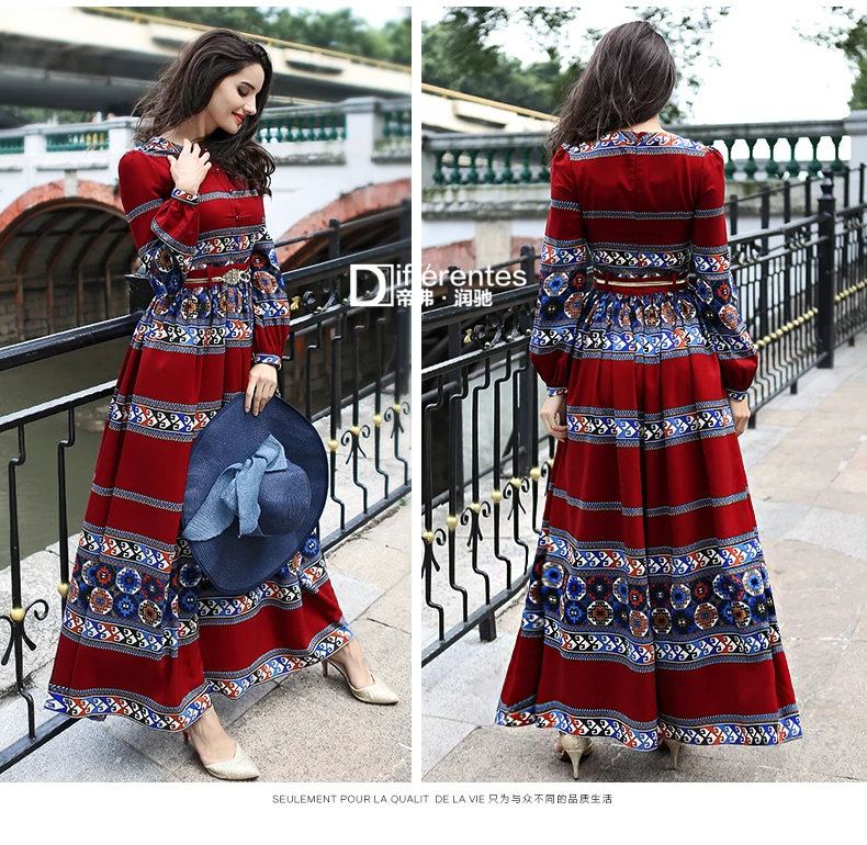 ヴィンテージドレス春夏新有名なカジュアルロングスリーブパーティー服シフォンプリント高級マキシドレススリムウエスト