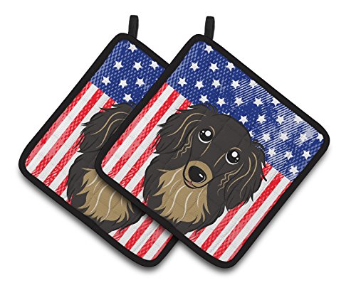 Caroline's Treasures American Flag & Longhair black & Tan Dachshund Pair of Pot Holders BB2143PTHD, 7.5HX7.5W, Multicolor