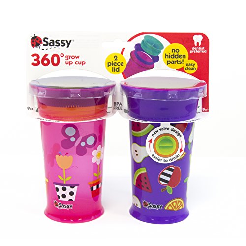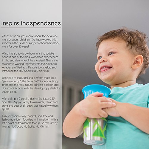-. Feature : Pediatric Dentist recommended 360˚ Spoutless Sippy Cup design, sip anywhere around the rim / Silicone valve automatically seals when child stops drinking to eliminate spills; spill-proof design / 3 simple parts easy-to-clean and assemble - Interchangeable lids fit all Sassy cups, and handles work with all non-insulated Sassy Sippy Cups / Helps children transition to an open cup; designed with a flared rim top for easy drinking and most closely resembles a "grown-up cup" / Top rack dishwasher-safe, BPA-free, 12oz, 2 count, 9+ months