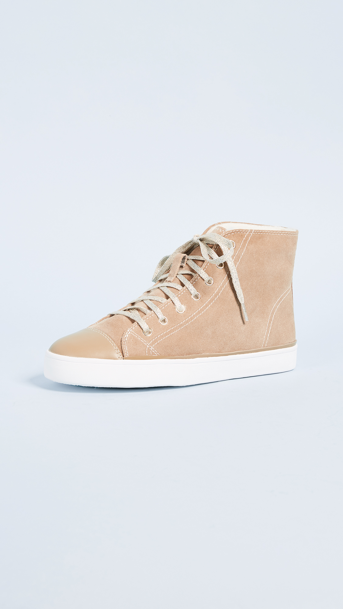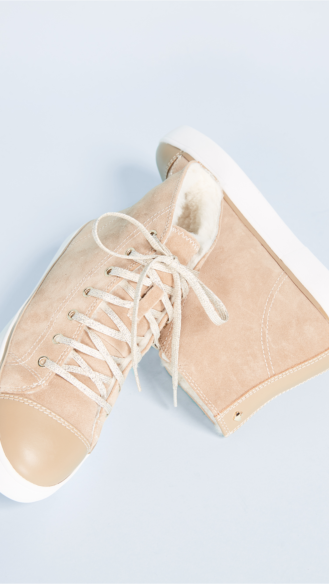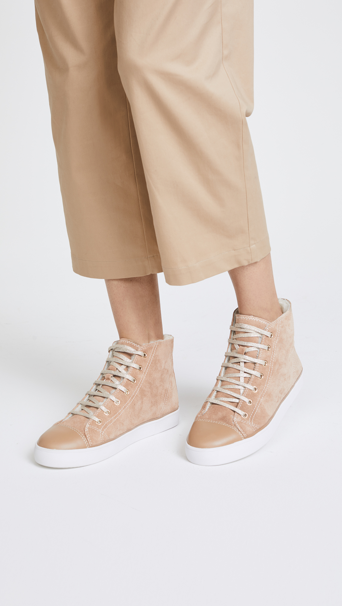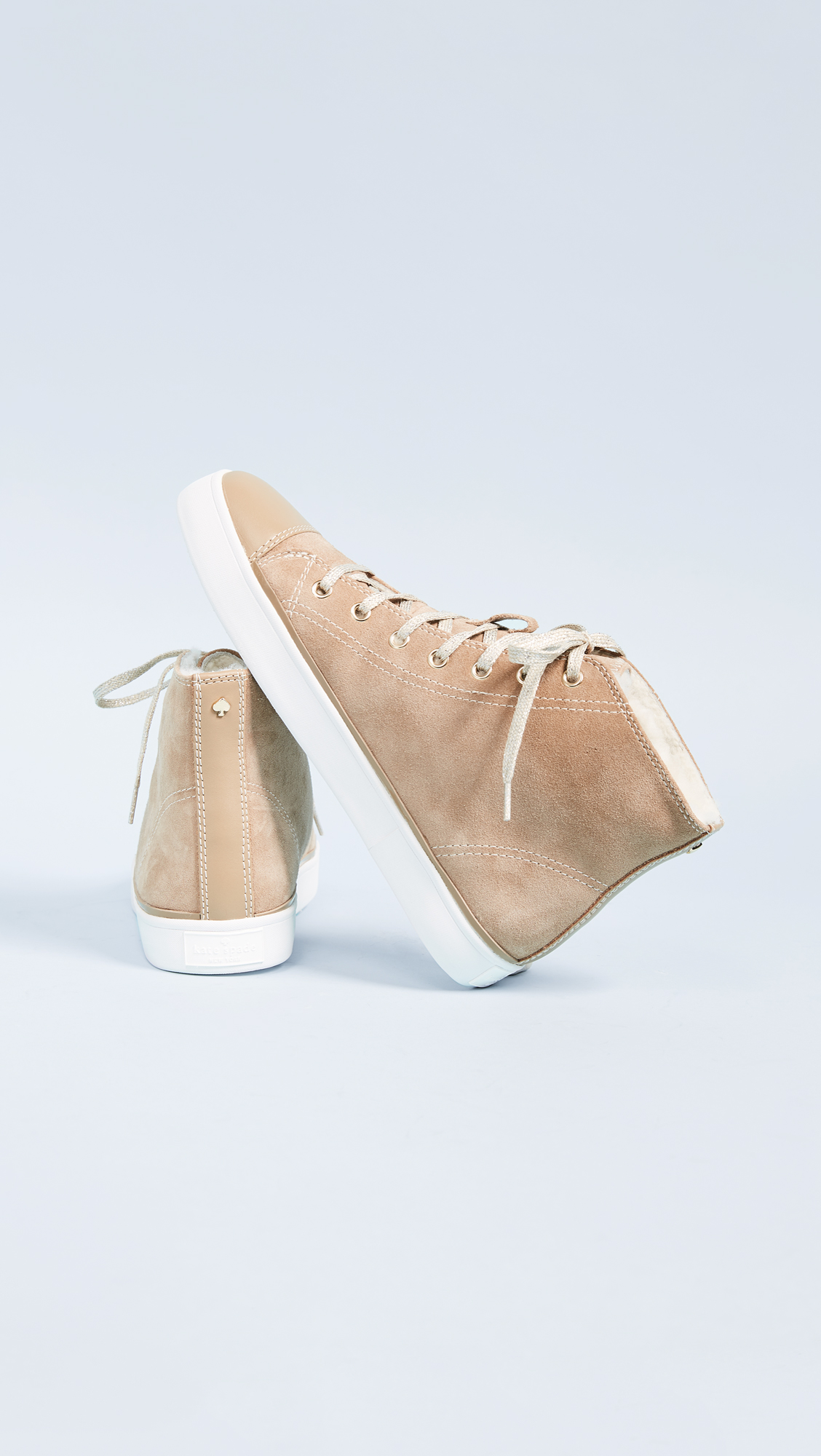 Suede Kate Spade New York high-top sneakers trimmed with a tonal leather toe cap. Plush shearling lining adds cozy warmth. Glittering lace-up closure. Rubber sole.