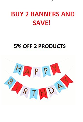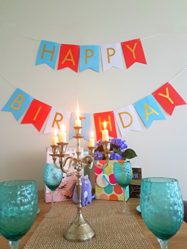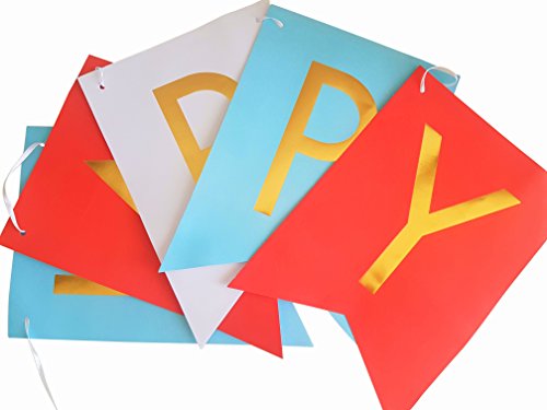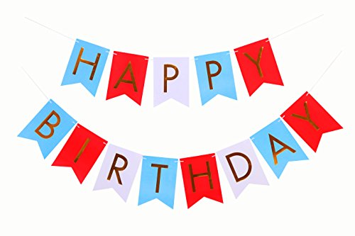 -. Title : Happy Birthday Banner Beautiful and Colorful Party Decoration from Paper for Kids, Boys and Girls and Adults, Blue, Red and White Pennants with Golden Letters and two stripes