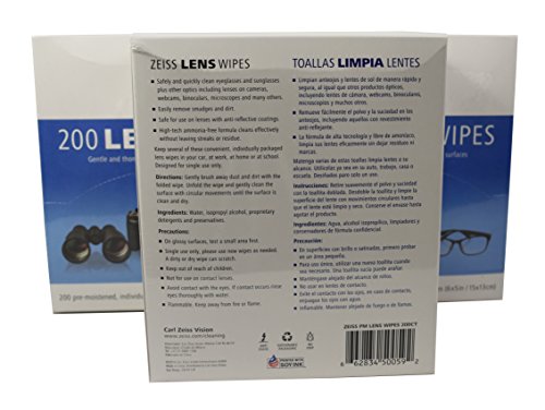 -. Binding : Health and Beauty -. Brand : Zeiss -. Feature : Caring for and cleaning your lenses has never been easier than with pre-moistened Zeiss wipes. / Your busy life deserves on the go convenience of individually wrapped and disposable lens cleaning wipes. / Safely and effectively clean your glasses, tablets, phones, and even camera lens for better viewing surfaces. / Go with a brand you can trust, Zeiss and never run the risk of scratching your lenses again. -. IsAdultProduct : 0 -. Label : Zeiss -. Manufacturer : Zeiss -. PackageQuantity : 1 -. ProductGroup : Health and Beauty -. ProductTypeName : HEALTH_PERSONAL_CARE -. Publisher : Zeiss -. Studio : Zeiss -. Title : Zeiss Pre-Moistened Lens Cleaning Wipes 3 Packs of 200