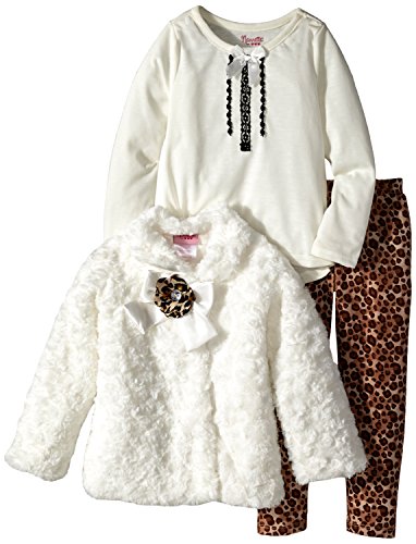 Nannette Little Girls' 3 Piece Faux Fur Jacket and Leopard Printed Legging Set, Off White, 4