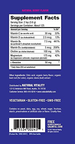 Calm Specifics Kids, part of Natural Vitality's Calm Specifics line, is a delicious natural berry flavor calm-focus formula for kids. Along with the benefits that children get from magnesium, Calm Specifics Kids also provides additional soothing effects from Suntheanine®, choline to support brain development, an easily absorbable form of B12 to support energy, B6 to help support mood, and D3 to promote healthy bones and teeth.Feature