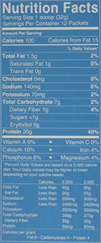 -. Feature : 20g of Protein, 1g of net Carbs, 100cal- per scoop / 1 Serving per packet / Gluten& Soy Free, no added Sugar / Made with high quality Whey Protein Isolates and Micellar Casein / Contains Real Cocoa and Cocoa Butter, Natural Flavors and sweetened with Erythritol, Stevia and Sucralose