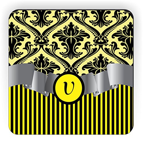 Rikki Knight Letter "V" Initial Yellow Damask and Stripes Monogrammed Design Square Fridge Magnet