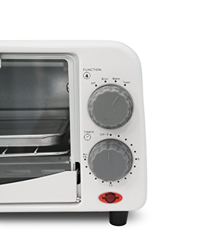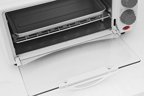 Bake, broil, and toast settings;15 minute timer with auto shut off and ready bell signal;Tempered glass door;Power indicator light and runs at 650 watts;Includes bake pan and wire rack;Power indicator light;650W