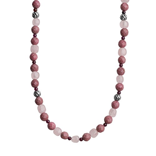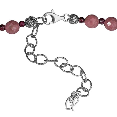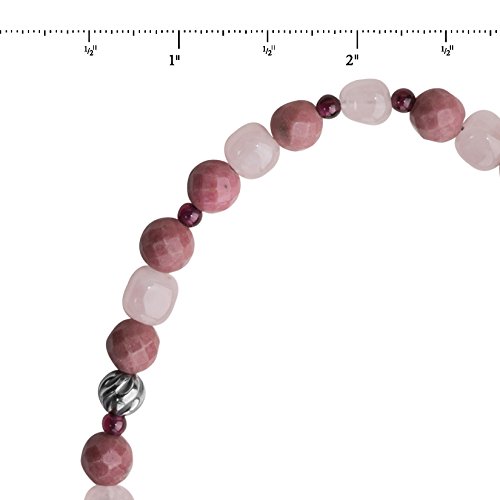 Gemstones of garnet, rose quartz and rhodonite beads are accented with ribbed sterling silver beads.