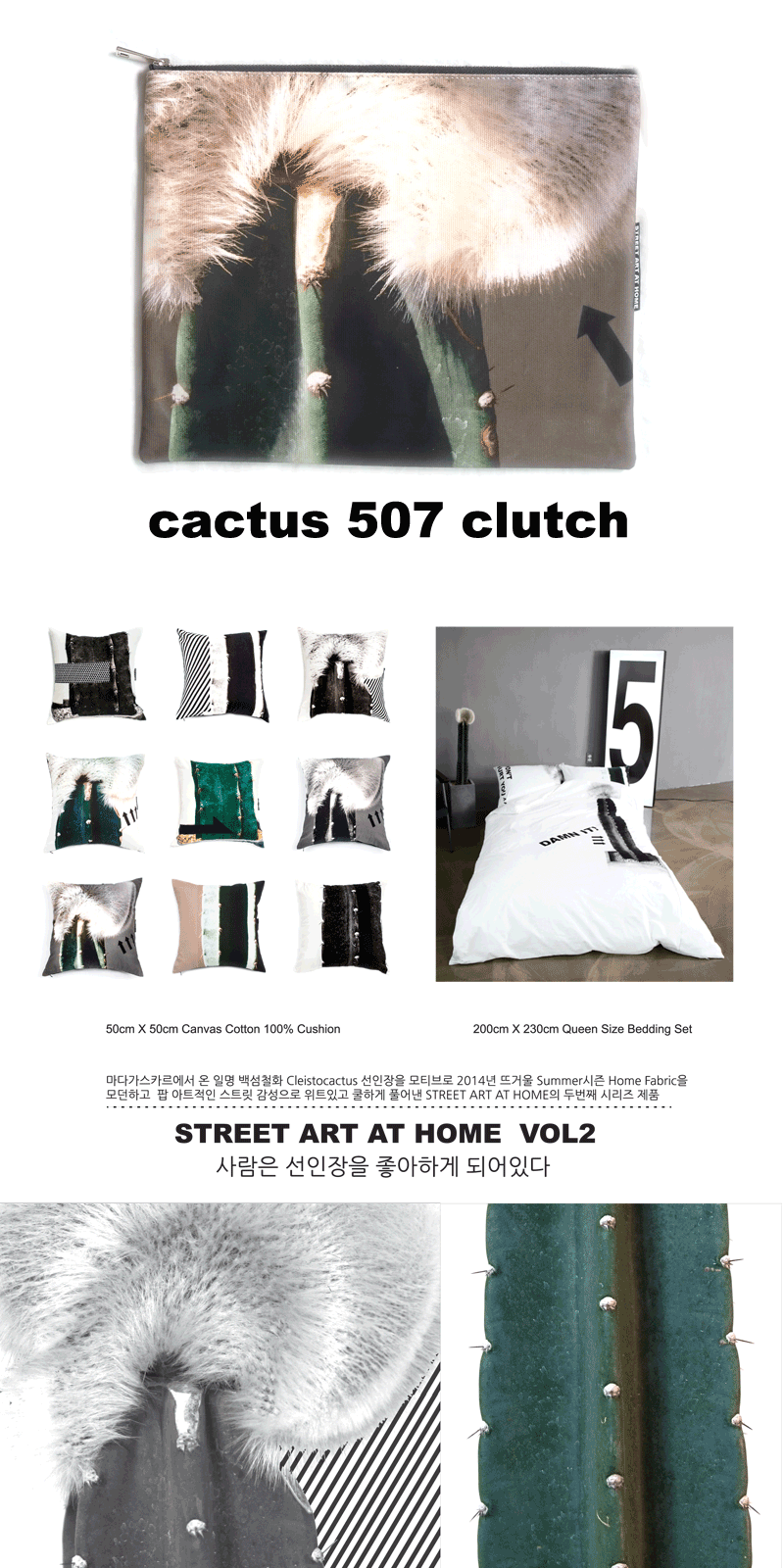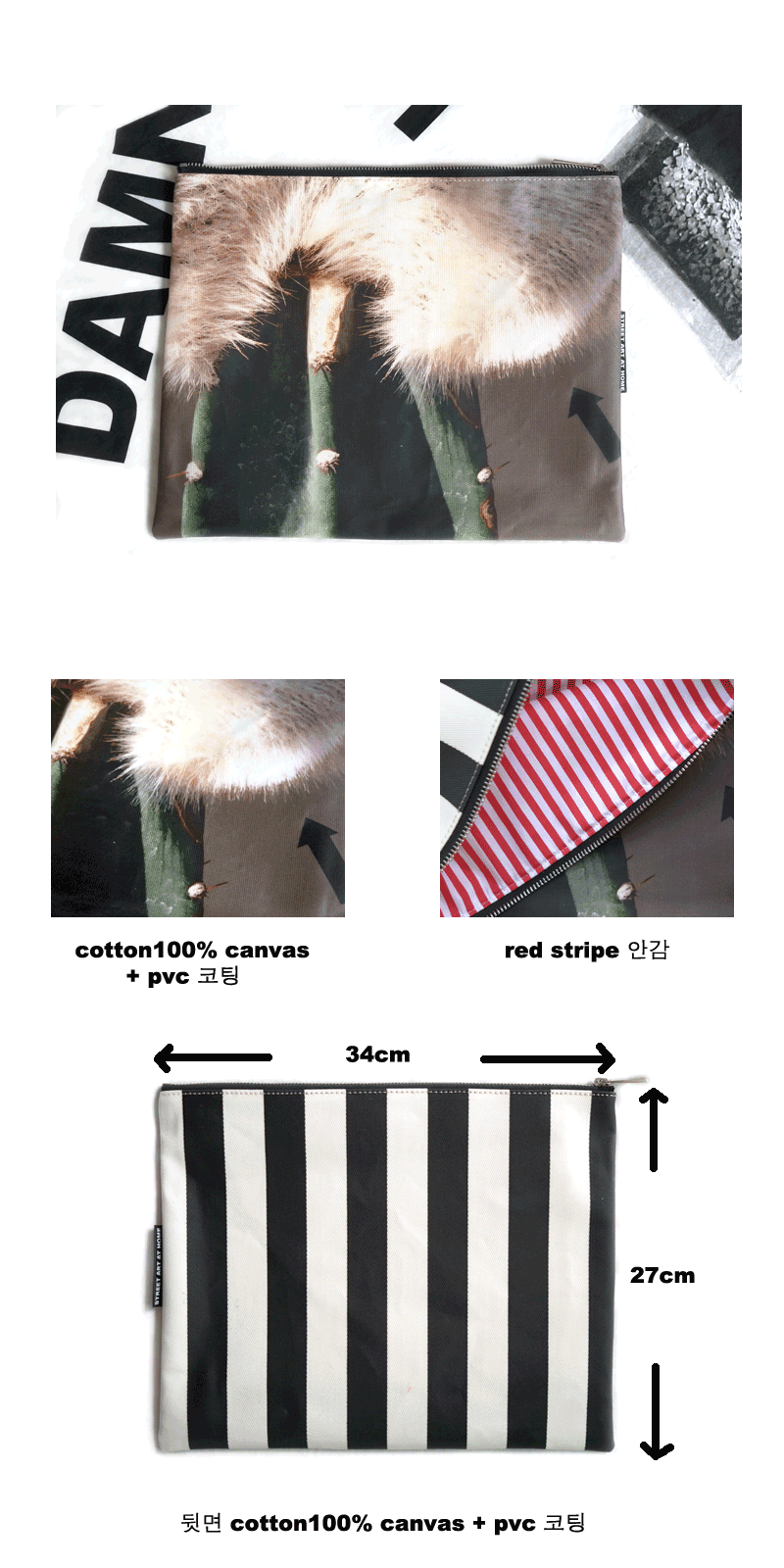 | STREET ART AT HOME VOL2 마다가스카르의 선인장 시리즈 감각적 스타일링을 연출 할 수 있는 선인장 클러치를 소개합니다 STREET ART AT HOME의 모든 쿠션 제품과 마찬가지로 COTTON 100% 캔버스 원단에 스트릿 아트 엣 홈의 선인장 사진은 프린트 한후 오염에 안전하고 실용적 사용감을 위해 무광 PVC코팅을 앞 뒤 모두 처리한 제품입니다 고급스러운 니켈 지퍼와 빨강 스트라이프 안감으로 견고하게 봉제되어 있습니다 사이즈는 가로 34cm 세로 27cm 노트북이 들어가는 기본 사이즈로 제작했습니다 |