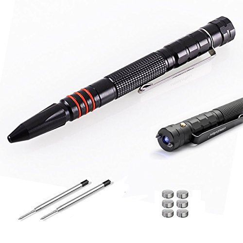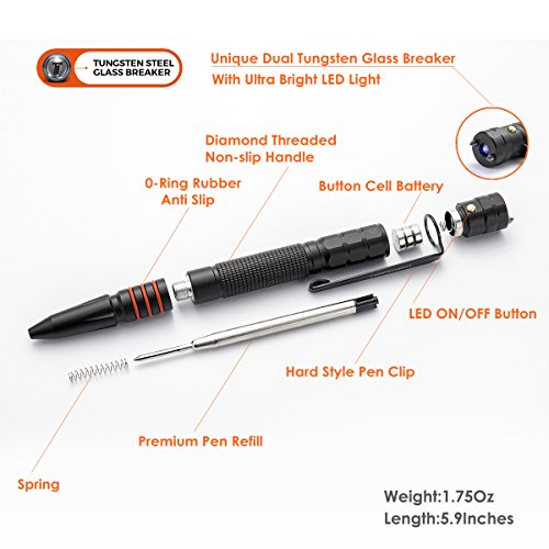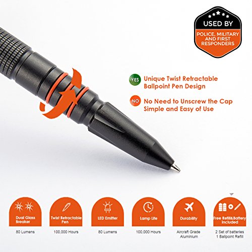 Tactical Pen, OUMAX Tactical Pen TP02 with Dual Tungsten Steel Glass Breaker, Twist Retractable Ballpoint Pen, Flash Light, Free Refills (2-Pack) and Batteries (2-Pack) - Black