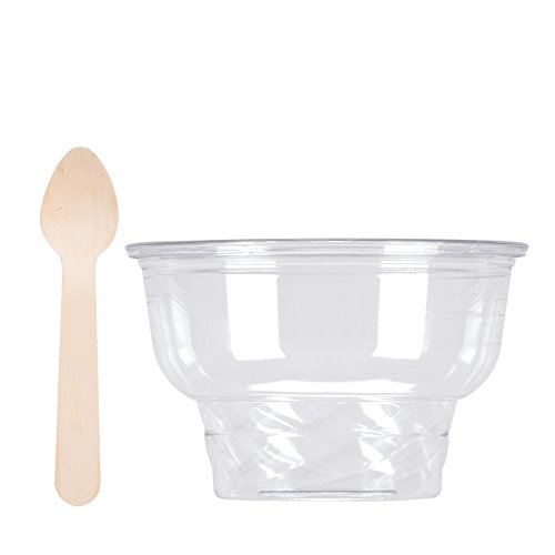 -. Feature : 50 pc clear sundae cups / ice cream bowls / 50 pc environmentally friendly wooden ice cream spoons (just like popsicle sticks, shaped like a spoon) / Bowl size - top diameter 3 13/16" | bottom diameter 2 1/4" | height 2 1/2" / Spoon size - length 3 3/4" | width 7/8" / Perfect for serving individual desserts, parfait, and pudding for your party