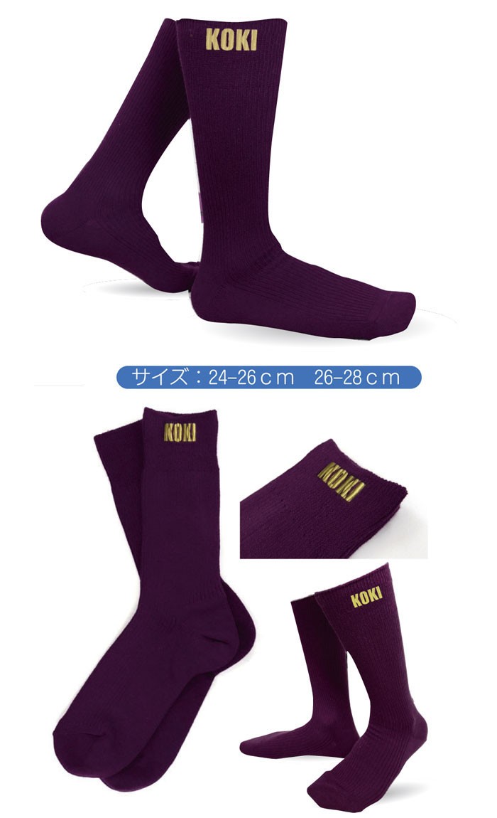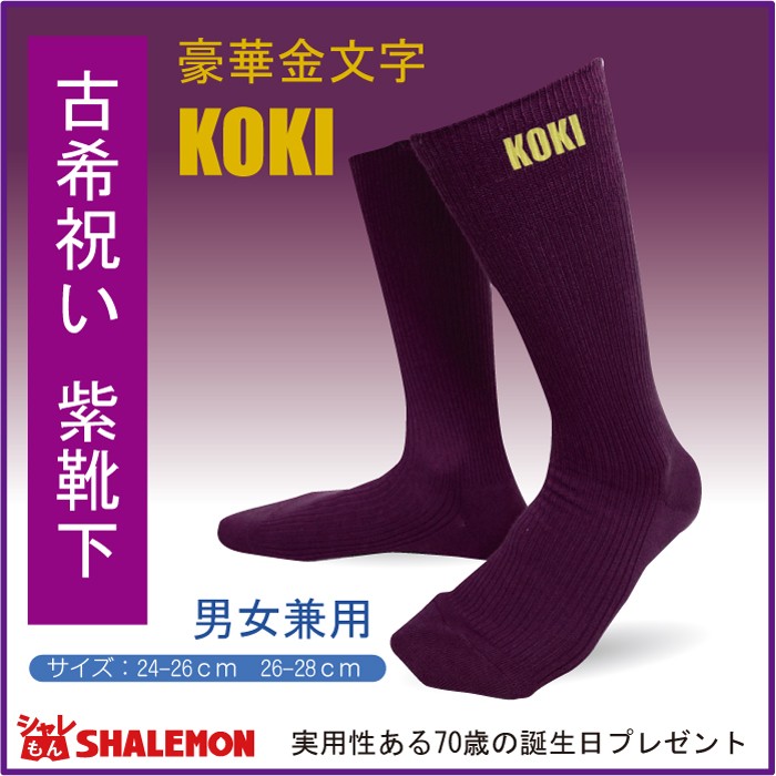 古希祝い 靴下です。足のサイズM:24~26cmL:26~28cmからお選びください。 メイン素材: 綿・ポリ混合 実用性ある古希祝いです。紫色のソックスに豪華な金文字で「KOKI」のデザインです。
