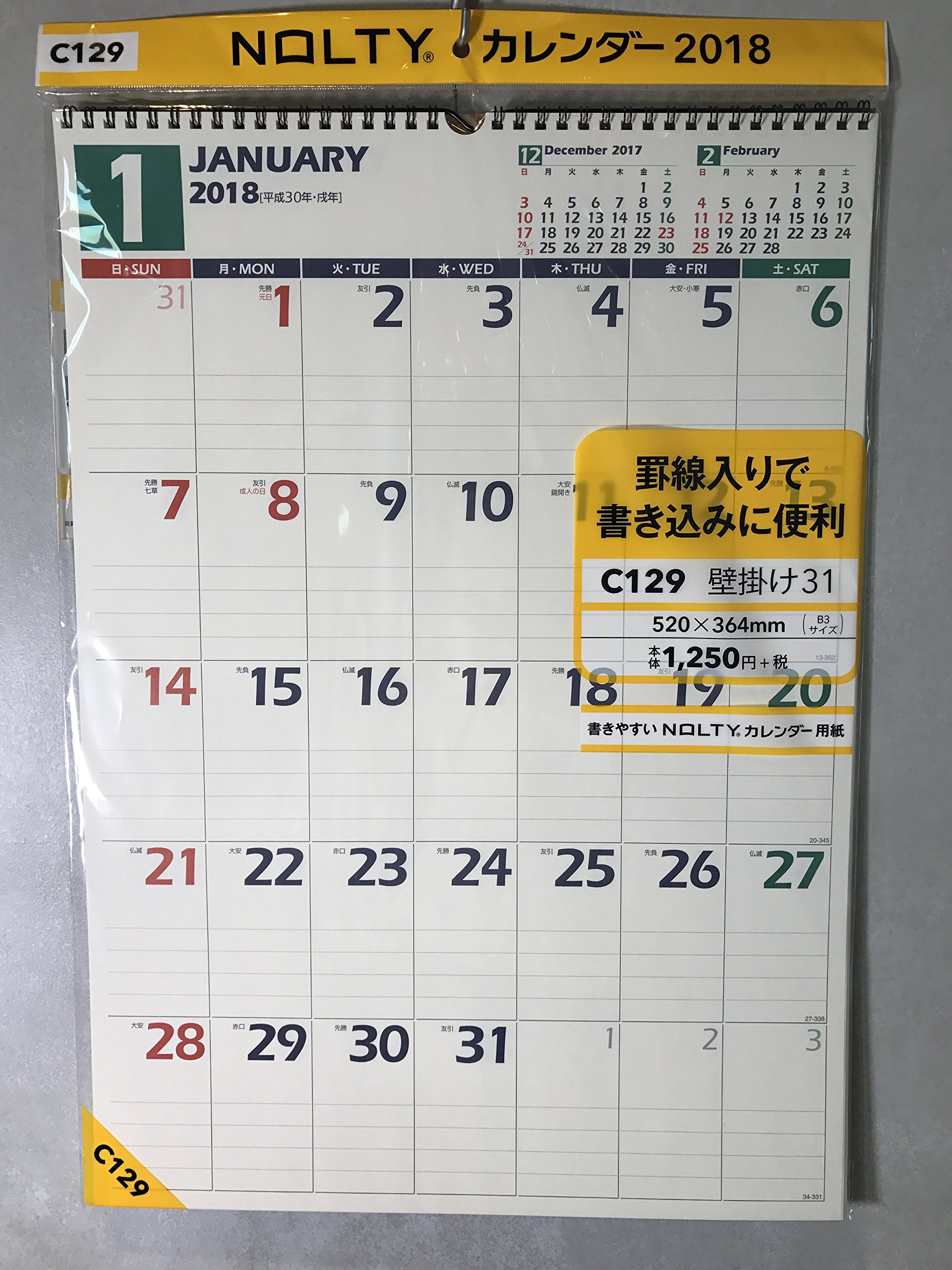 Following 2017, get this calendar soon. With large format (50 cm x length 35 cm) there is plenty of space to draw, so the family can fill in the schedule one after the other. When the moon changes, it is convenient to look back on various things because it lets you turn around at the binding point with a spring, not cut out the page. I thought that it would be nice to have another compact method because the cardboard box of the packaging was so big and I was surprised, but I think I will use this calendar from now on.