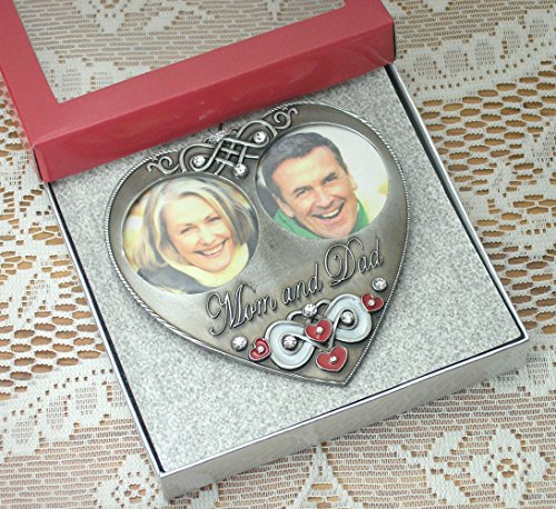 - Feature : Mom and Dad Brushed Metal Double Photo Frame Ornament / Photo Openings holds two 1.75" photos / Ornament measures 4"x4" and comes in a gift box ready for wrapping / Vintage look with jeweled accents. / Gift boxed with a ribbon for hanging