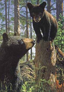 A bear cub sits on top of a stump while the mother watches, the 3D effect is terrifying!