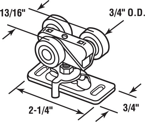 This closet door roller assembly is constructed of a steel bracket and a plastic carriage. The bracket’s base measures 2-1/4 in. x 3/4 in., and it features 3 plastic wheels that are spaced apart 13/16 in. on center. The wheels are constructed of durable plastic which provide for a smooth, long-lasting, quiet operation, and they feature 3/4 in. diameter FLAT edges. These roller assemblies mount on the tops of by-pass sliding doors, bi-fold doors and pocket doors. They are adjustable once installed, and they are used by many pocket door manufacturers. These roller assmblies fit into 1-1/8 in. wide track (inside dimension, wall-2-wall).Feature