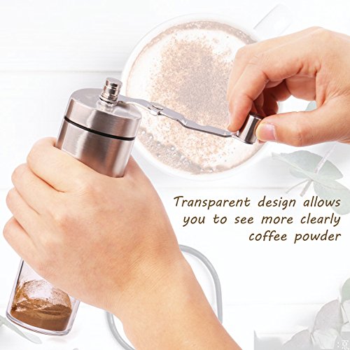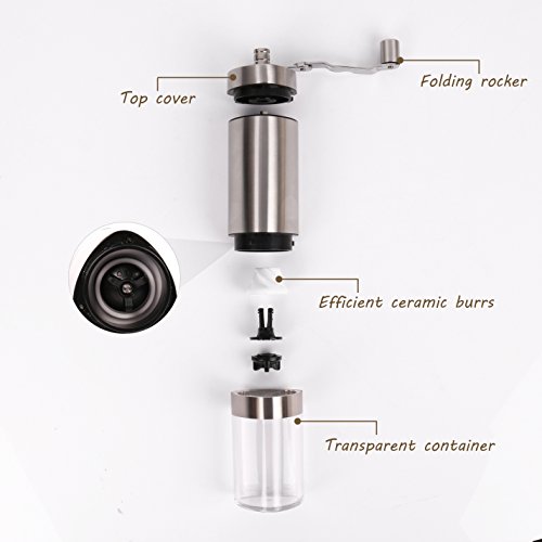 【REASONABLE DESIGN】Arc triangular prism easier to hold, allowing you to grind coffee more effort. Folding rocker takes up less space, you can more easily carry it anywhere. The lower part of the transparent design allows you to see more clearly coffee powder.