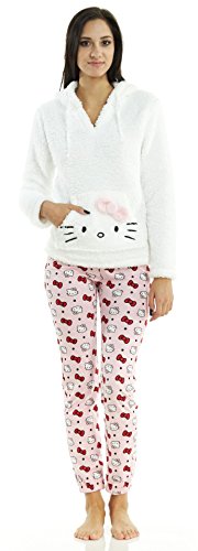 Our softest pj's ever! These adorable sherpa pajama sets for women feature everyone's favorite Kitty on the pouch style pocket. The super soft white plush top features v-neck styling with a hood. The 100% cotton pajama bottoms have an elastic at the bottom of the leg. You will want to live in these! Junior Cut.