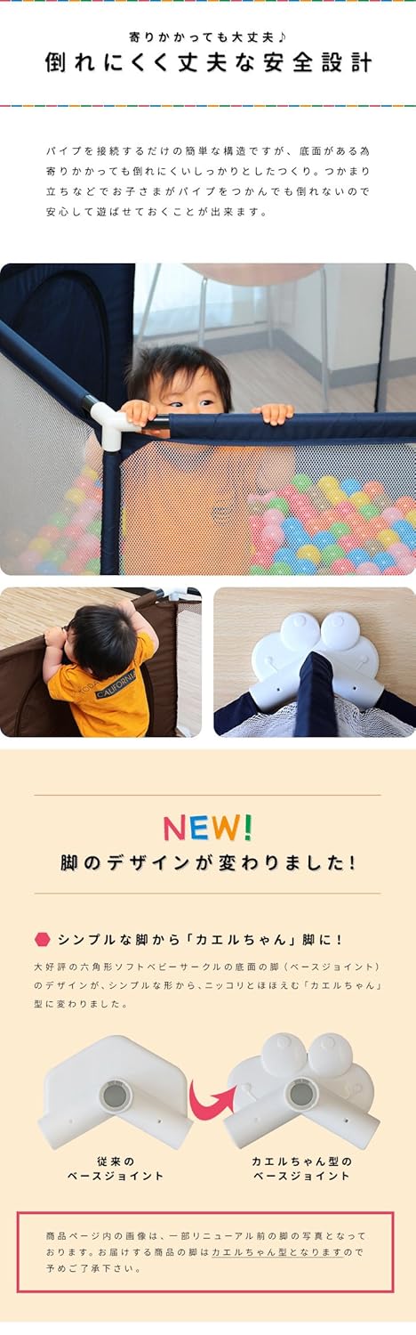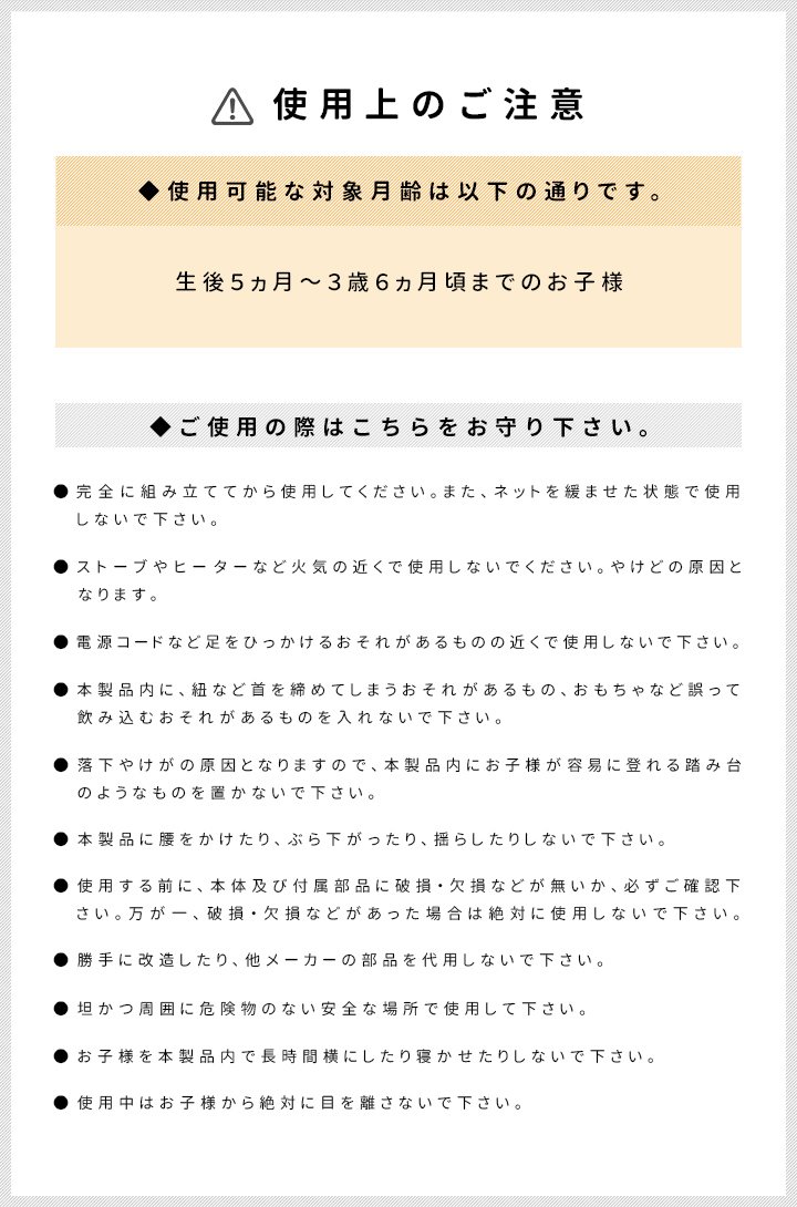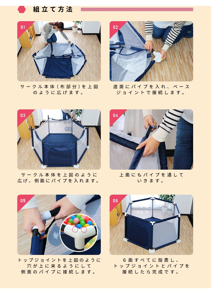対象年齢 5ヶ月~3歳6ヶ月 セット内容 サークル本体、パイプ×18本、トップジョイント×6個、ベースジョイント×6個