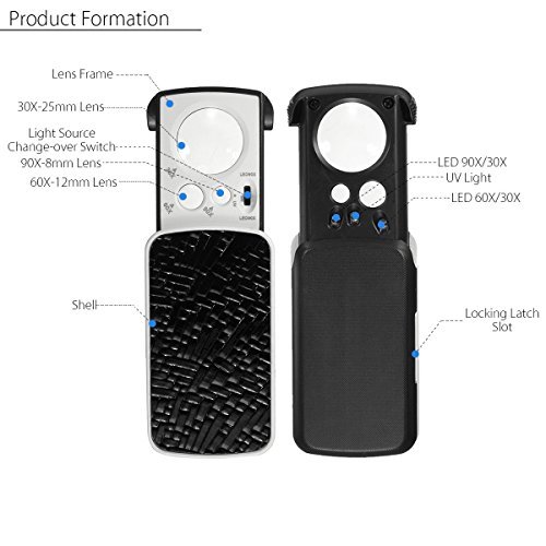 - ✪ Built-in LED Lights and UV Blacklight | Lens Diameter: 30X (25mm), 60X (12mm), 90X (8mm).