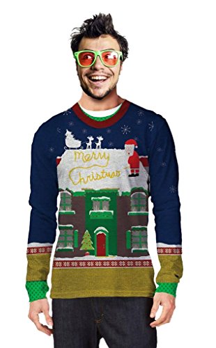 -. Brand : Faux Real -. Department : mens -. Feature : Perfect for Ugly Sweater Holiday Parties / Machine Wash / Photorealistic ugly Christmas sweater design long-sleeve T-shirt / 100% Polyester -. ProductGroup : Apparel -. ProductTypeName : ADULT_COSTUME -. Title : Faux Real Santa Has To Go Ugly Sweater Long Sleeve T-Shirt
