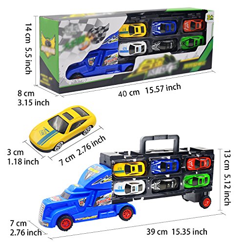 【Size】The size of the toy's packaging is 40 cm long, 8 cm wide and 14 cm high; and the size of the truck is 39 cm long, 7 cm wide, and 13 cm high; the size of the small car is 7 cm long, 3 cm wide, and 1.5 cm high.