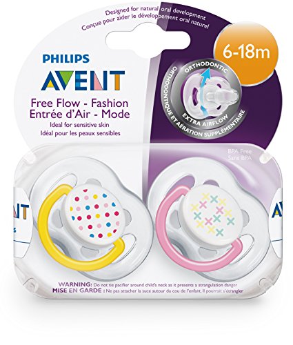 -. Binding : Baby Product -. Brand : Philips AVENT -. Color : Pink -. Feature : Orthodontic symmetrical collapsible nipple so right side up or upside down, Philips avent pacifiers help ensure natural development of teeth and gums / Taste and odour-free silicone nipple makes for an easy transition between pacifier, breast and bottle / Includes two pacifiers with extra freeflow air holes for sensitive skin. Ideal age range: 0-6 months / WARNING: Do not tie pacifier around child's neck as it presents a strangulation danger -. Label : Avent -. Manufacturer : Avent -. ProductGroup : Baby Product -. ProductTypeName : BABY_PRODUCT -. Publisher : Avent -. Studio : Avent -. Title : Philips AVENT BPA Free Contemporary Freeflow Pacifier