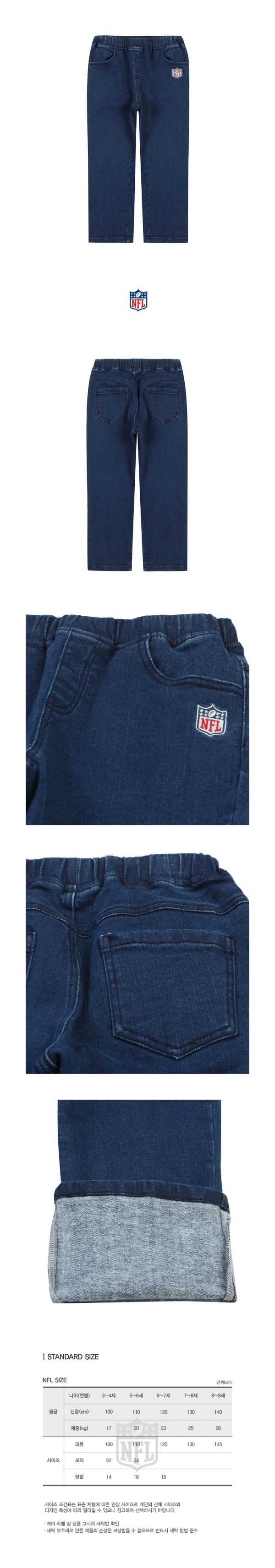 백기모 데님 스판 일자핏 팬츠.스판성이 좋아 착용시 활동이 편함.앞NFL엠블럼 자수가 포인트.상의 모든 아이템과 코디가능.(뒤집어 단독세탁)