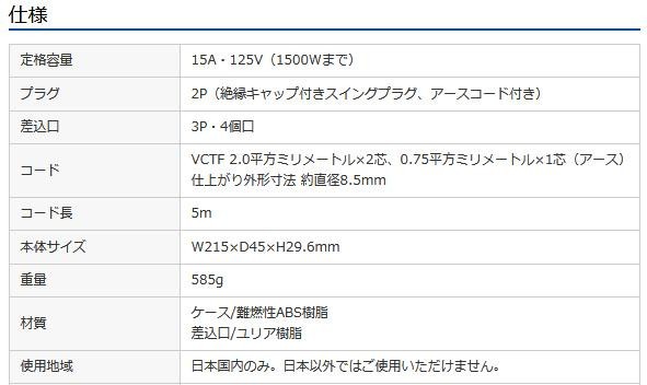 fk094igrjs便利な一括集中スイッチ付の電源タップです保護被覆付きで、断線しにくい丈夫なコードを使用しています サイズ 個装サイズ:4×22×12cm 重量 個装重量:780g 生産国 中国 一括集中スイッチ付き、2Pスイングプラグの電源タップ 便利な一括集中スイッチ付の電源タップです保護被覆付きで、断線しにくい丈夫なコードを使用しています
