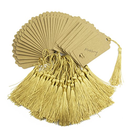 Makhry 100 Pcs Imported Rectangle Kraft Paper Bookmarks Gift Tags Wedding Favor Bonbonniere Favor Thank You Gift Tags with 100 pcs Tassels (Brown&Light Gold)