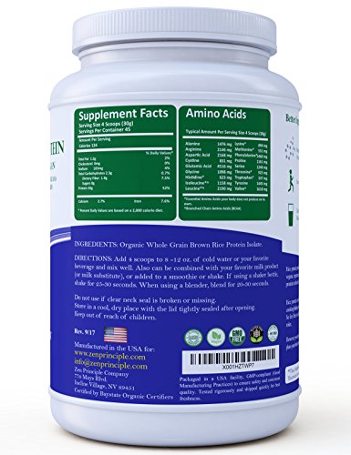 -. Brand : Zen P.R.Inciple -. IsAdultProduct : 0 -. Label : Zen P.R.Inciple -. Manufacturer : Zen P.R.Inciple -. PackageQuantity : 1 -. ProductGroup : Health and Beauty -. ProductTypeName : DIETARY_SUPPLEMENTS -. Publisher : Zen P.R.Inciple -. Studio : Zen P.R.Inciple -. Title : 3 lb. Organic Brown Rice Protein Powder. USDA Certified. 90% Protein, Maximum Available. No GMO, Soy or Gluten. Vegan. Full Spectrum Amino Acids (BCAA). Ultra-fine Powder Mixes Best in Drinks.