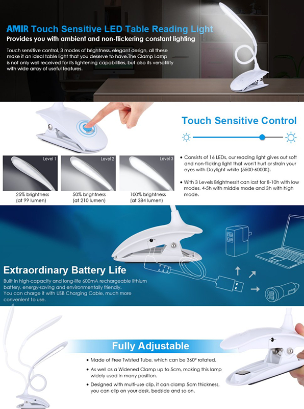 - Working time: 2h (100% brightness), 5h (50% brightness), 8h (25% brightness)