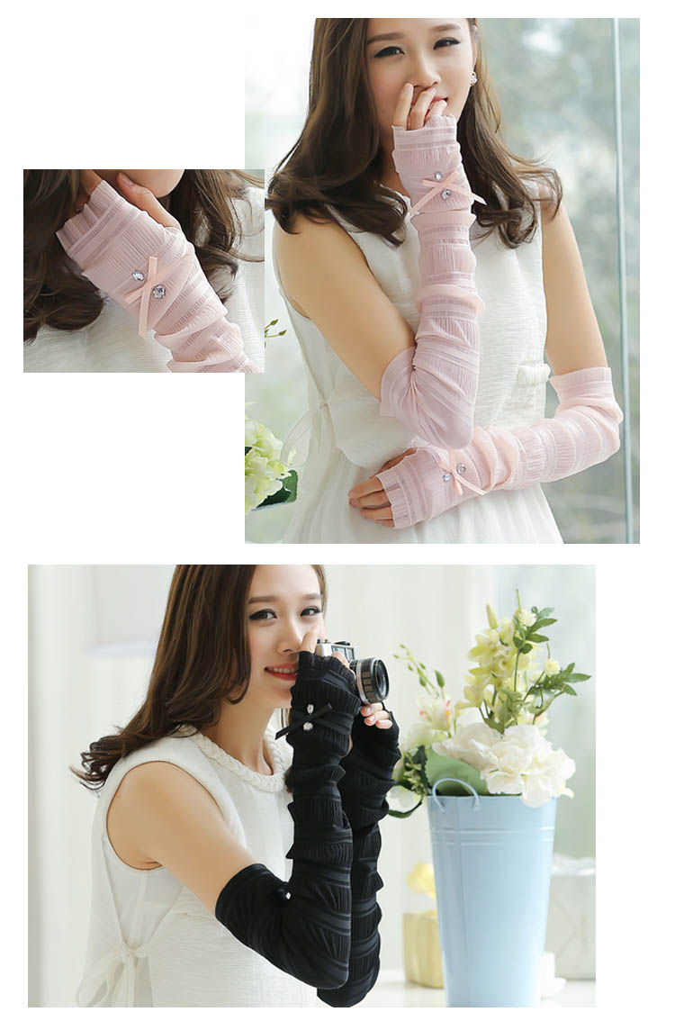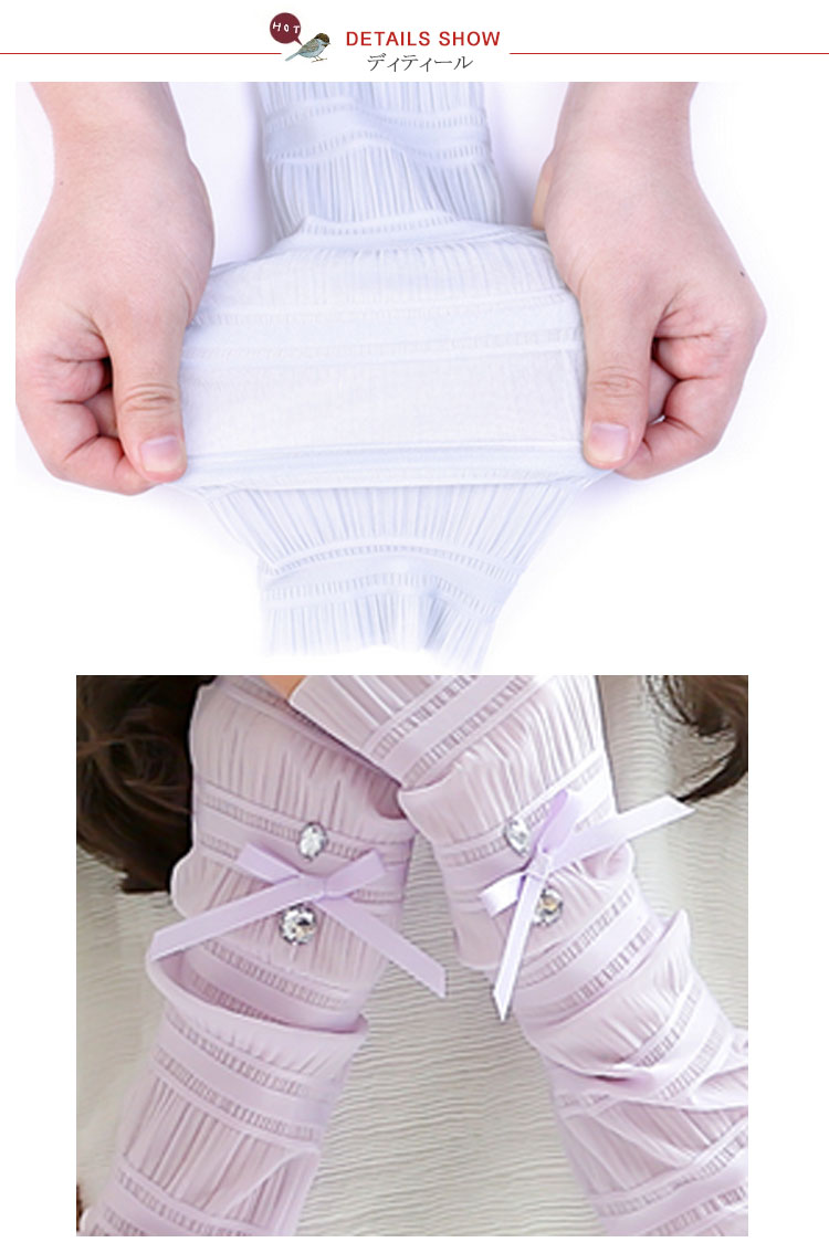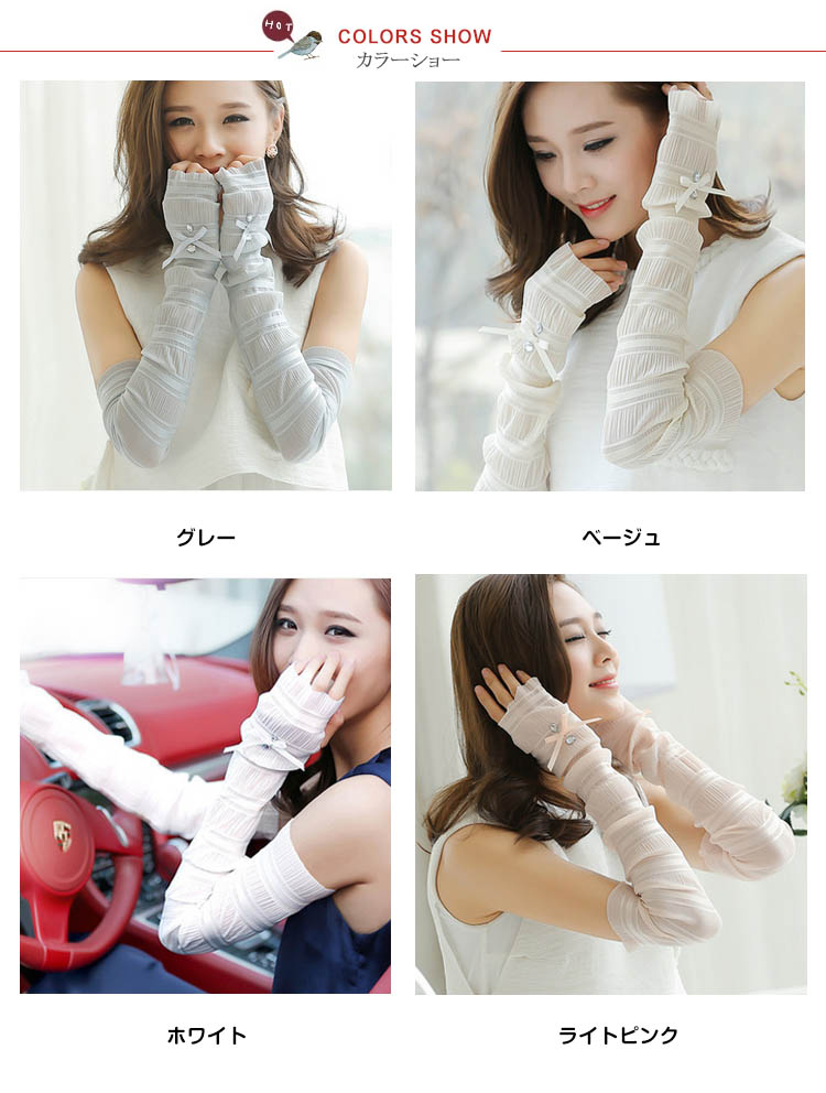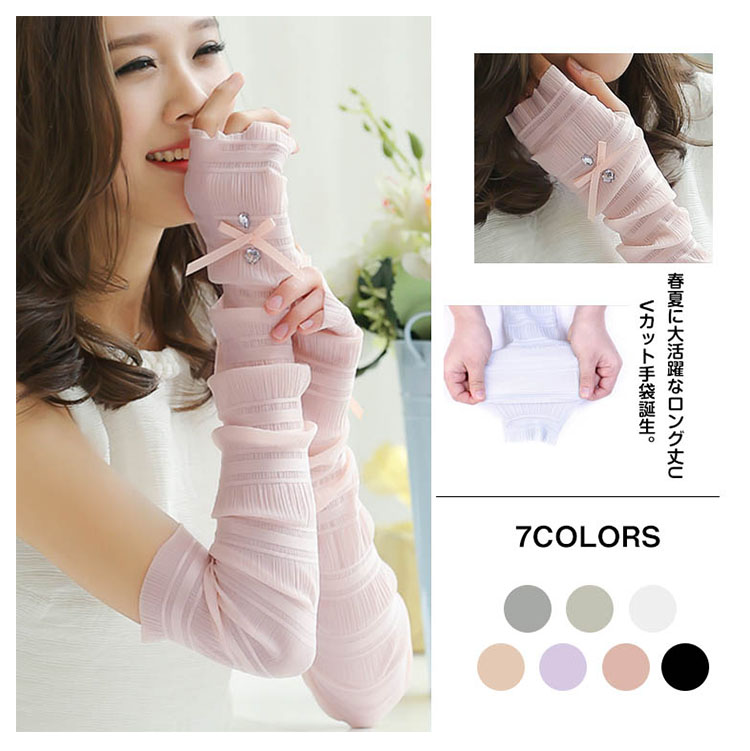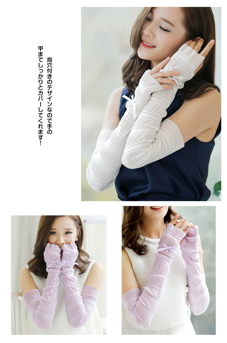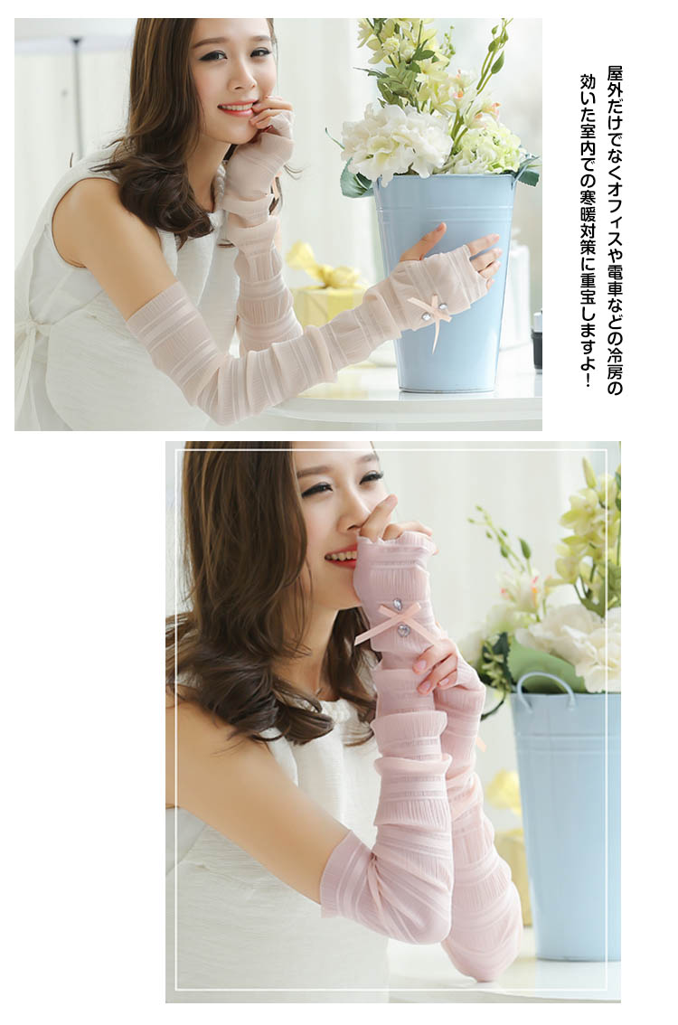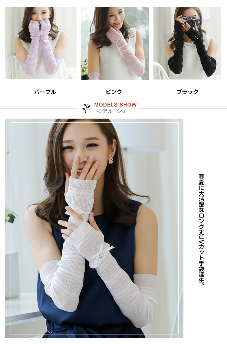 | 春夏に大活躍なロング丈UVカット手袋誕生。指穴付きのデザインなので手の甲までしっかりとカバーしてくれます!手首回りのリボンやビジュー使いも可愛いアクセント!!通勤やお買い物などのデイリーシーンはもちろん、レジャーにドライブに一度使うと手放せない存在に。屋外だけでなくオフィスや電車などの冷房の効いた室内での寒暖対策に重宝しますよ! | |