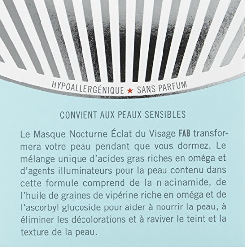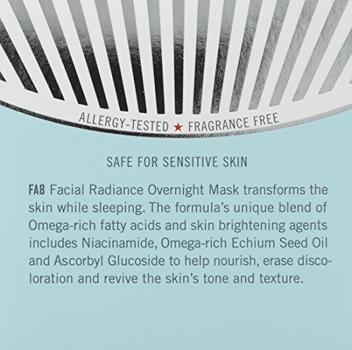 -. Binding : Health and Beauty -. Brand : First Aid Beauty -. EAN : 0763529631512 -. Feature : 1.7 oz / Ideal for all skin types, even those with sensitive skin. / Brightens, smooths and evens skin tone. Improves the texture of the skin. Hydrates and nourishes. / No Parabens, Harsh Chemicals or Colorants. / Safe for Sensitive Skin. -. Label : First Aid Beauty -. Manufacturer : First Aid Beauty -. Model : 412UK -. MPN : 412UK -. NumberOfItems : 1 -. PackageQuantity : 1 -. PartNumber : 412UK -. ProductGroup : Beauty -. ProductTypeName : BEAUTY -. Publisher : First Aid Beauty -. Studio : First Aid Beauty -. Title : First Aid Beauty Facial Radiance Overnight Brightening Mask -. UPC : 852575005054