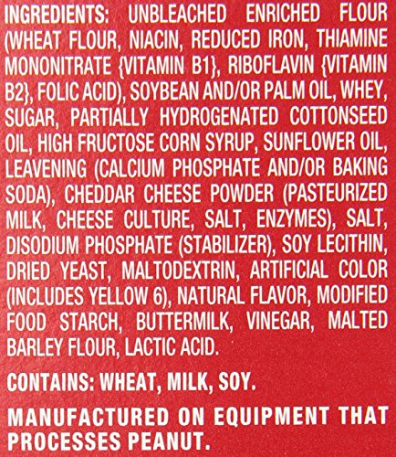 Unbleached Enriched Flour (Wheat Flour, Niacin, Reduced Iron, Thiamine Mononitrate {Vitamin B1}, Riboflavin {Vitamin B2}, Folic Acid), Soybean and/or Palm Oil, Whey, Sugar, Partially Hydrogenated Cottonseed Oil, High Fructose Corn Syrup, Sunflower Oil, Leavening (Calcium Phosphate and/or Baking Soda), Cheddar Cheese Powder (Pasteurized Milk, Cheese Culture, Salt, Enzymes), Salt, Disodium Phosphate (Stabilizer), Soy Lecithin, Dried Yeast, Maltodextrin, Artificial Color (Includes Yellow 6), Natural Flavor, Modified Food Starch, Buttermilk, Vinegar, Malted Barley Flour, Lactic Acid.