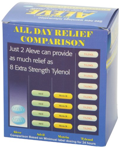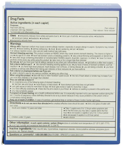 ReleaseDate : 2015-06-22 Studio : Aleve Publisher : Aleve Binding : Health and Beauty Product Description Aleve 1's 50 packets. Active ingredient (in each caplet) naproxen sodium 220 mg (naproxen 200 mg). Uses temporarily relieves minor aches and pains due to: minor pain of arthritis muscular aches backache menstrual cramps. Uses temporarily relieves minor aches and pains due to: headache toothache the common cold temporarily reduces fever. 0