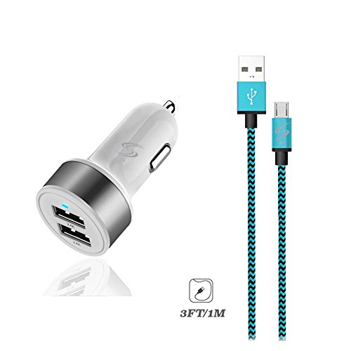 StyleTech Inc. Aluminum Nylon Braided Series 3 Feet Micro-USB Syncing/Charging Data Cable for Android, Samsung, HTC, Windows, Motorola, Tablets, etc. (5.) Blue + White Car Charger)