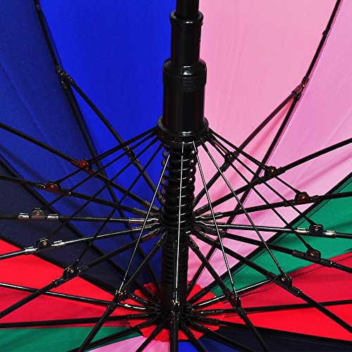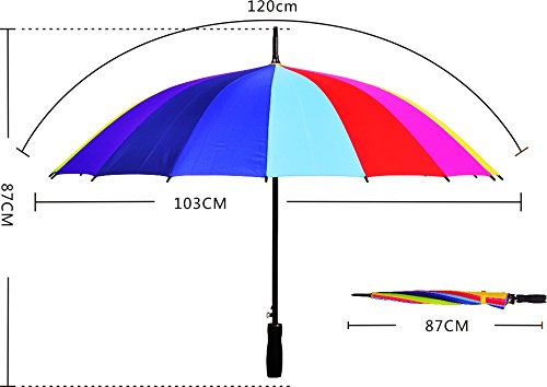 -. Feature : Unique design of 16 durable fiberglass ribs and sturdy chrome electric metal central rob, this umbrella can enhance its windproof effect, prevent it from flipping inside out and maintain the elegant rounded shape. / Made of durable soft frosted rubber, the straight style handle provides you a very good and comfortable grip. / Sturdy, Lightweight Umbrella with Auto Open Feature - The automatic easy-open button is a cinch to use with just one hand. Take ultimate rain and sun protection with you wherever you go! / It's large enough to shelter both you and your loved one from the downpour, , rainbow color is very shinny will surely cheer you up in any dismal weather / Measures 87cm long and 103cm in diameter when open. It's also a good gift.
