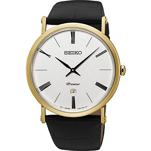 SEIKO Premier SKP396P1 Silver Leather Man Watch SEIKOSKP396P1 oriented CalendarioEste for Man, has the box Steel Circular shaped and colored Silver. The Black Leather Strap is. The crystal is sapphire, quartz movement and analogue display. It belongs to the Premier collection and is manufactured in Japan. It can dive up to 30 M. Its functions include the following: Calendar. Classic style, this watch is perfect for Birthday. Diameter: 40.70 mm