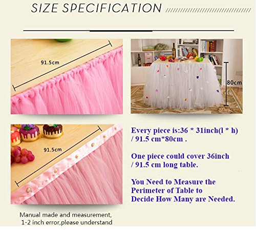 Features: This pink tulle table skirt will create a soft and luxury atmosphere to your party and will add romance to your special event. This beautiful handmade pink tablecloth will make your party decoration a showpiece that is unforgettable, fun, classic and elegant. Fluffy tulle, which is every girl's favorite and love. You can put lights behind the pink tablecloth or run through it to make it even more magic. This tulle tablecloth can be used for princess party decoration, baby shower, girl princess party,birthday party, room decoration,wedding table skirt,wedding tablecloth and even fun to wear and play around with. Included velcro makes it easy for you to attach the rectangle table skirt to any surface. Perfect for Baby Showers, Wedding party, bridal showers, Christmas, New year, Spring, Valentine's day, Easter, Mother's Day, Father's Day,Thanksgiving Day,ceremony, graduation, or for everyday entertaining.This tutu tablecloth will make your party is elegant and unforgettable. Specifications: Item Type: Pink Tulle Table Skirt Material:Polyester Mesh tulle.(Our tulle is made of Polyester double line.Polyester double line mesh feel good, soft and flexible.) Product Size: 31 x 36 inch(h x l)/80 x 91.5 cm. NOTICE::You need to measure the perimeter of table to decide how many are needed, this listing is effect picture. Item Color:Pink. Note: It is recommended that not wash the table skirt. Package List: 1 x Tulle tablecloth and Velcro 1 x English Manual 0 |