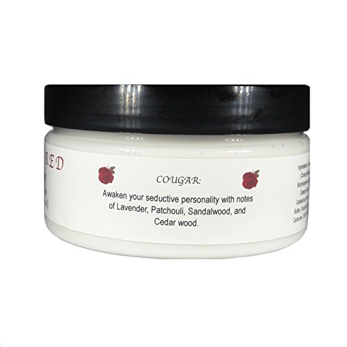 COUGAR: Awaken your seductive personality with notes of Lavender, Patchouli, Sandalwood, and Cedar wood. This is a strong seductive scent. Crisp and inviting. Created with 15 various notes to achieve this deeper more sensuous fragrance guaranteed to last hours as it dries down to its end notes on the skin. If you are sensitive to strong fragrances this one is strong use lightly Our Body Lotions and Butters provide soft and gentle daily Moisturizing benefits to even the most delicate of skin. Infused with nourishing Coco Butter and luxurious Shea and Mango Butters, pamper your skin with this non-greasy Formula that will provide a beautiful fragrance and hydration. Apply as needed to dry skin for a smooth powdery soft finish.Feature