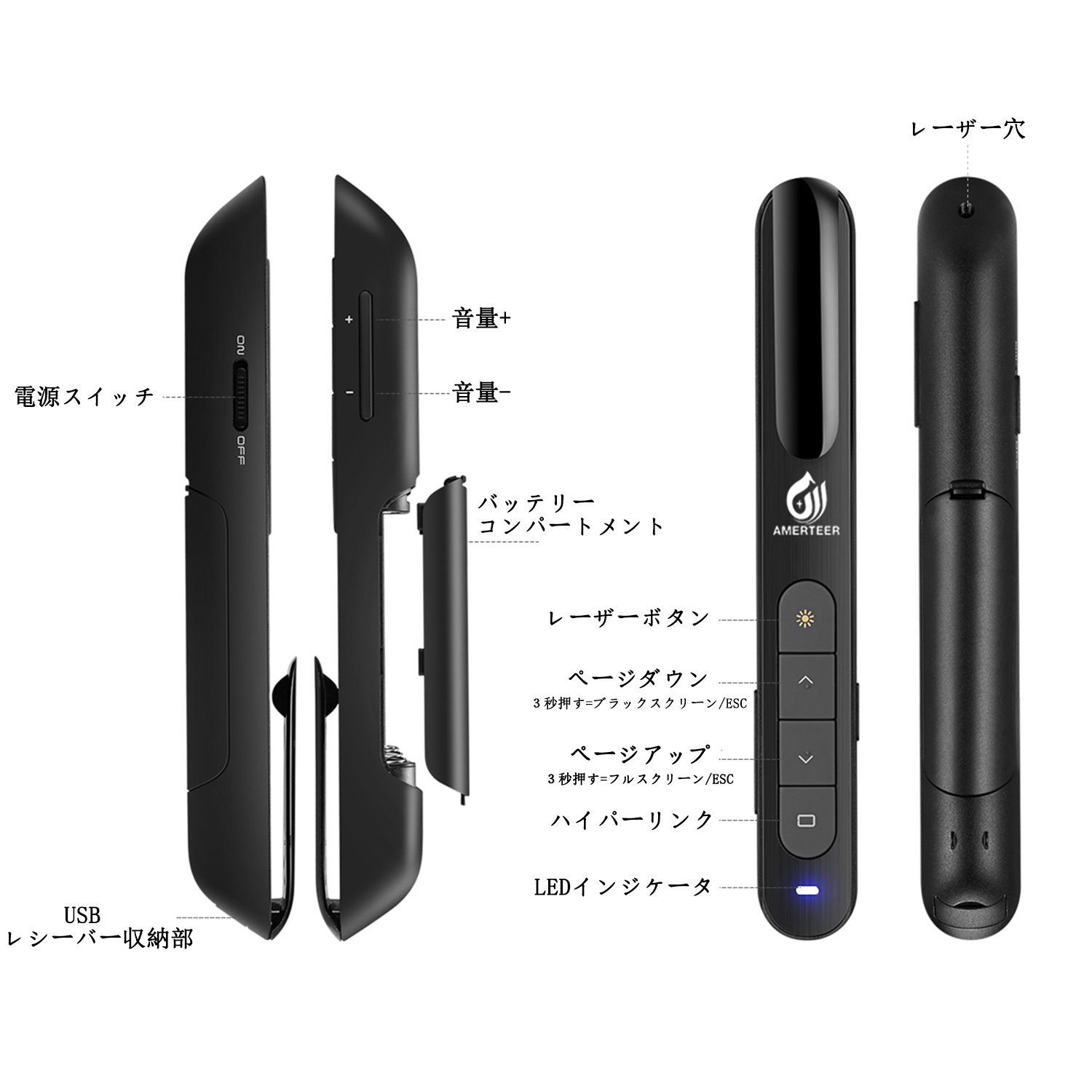Just by inserting the included USB receiver into the USB port of your computer, you can use this wireless pointer easily.
