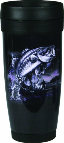 -. Feature : Beautiful Bass and fisherman design / Spill proof open/close screw on lid / 16oz mug is made with stainless steel and plastic / Keeps your favorite beverage warm or cool / Hand wash only