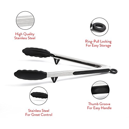 Unique Design: -Pro Kitchen Tools for Multiple Tasks:Mix salad, serve ice, cater a picnic,etc. -Robust but flexible spring mechanism for firm control.(Pull out to lock and push in to use). -The "O" ring and locking mechanism for convenient locking and easy hanging. We can pull the lock and store them in drawer or hang them while using minimum space! -The tongs can not only easily fetch the food in high position, but fetch the food in the pan without letting the oil splash to harm. -The handy resting foot keeps the business ends angled up and off the surface so your Grill Tongs stay above the counter keep your countertop clean and prevent the threat of contamination.